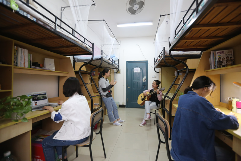 舒适住宿及配套设施 学生公寓住宿标准为四人间,上床下桌,有独立卫生间和盥洗室。 1.每栋公寓楼都安装有空气能热水系统,为每间公寓供应洗浴热水,同学们在卫生间就可以洗上热水澡; 2.学校为每间公寓安装有冷暖空调,能在冬季和夏季为同学们提供舒适的环境; 3.三大电信运营商的宽带都已接入每间公寓,同学们可自由选择; 4.公寓楼的每层设置有公用直饮水机,自来水经五级过滤,达到纯净水标准,而且还可供应冷热水,为同学们提供经济、清洁的饮水服务; 5.公寓楼每间宿舍都安装了洗衣机和烘干机,为同学们提供洗衣和烘干服务; 6.公寓楼进门大厅设有自动售货机,出售各类饮料和小食品,能解同学们的燃眉之急。 7.学校在学生生活区的东西面各设有一条商业街,共有120余个商铺,为同学们提供各类商业服务。